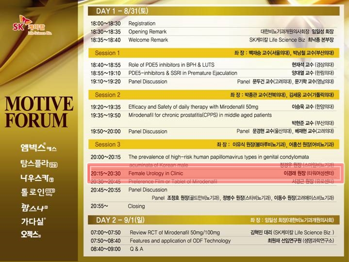 전국의 비뇨기과 교수님과 개원의선생님들을 대상으로 "개원가의 여성비뇨기과"라는 제목으로 개원가의 다양한 여성비뇨기과질환에 대해서 강의를 하였으며 많은 교수님과 선생님들로부터 호응을 받으셨습니다.